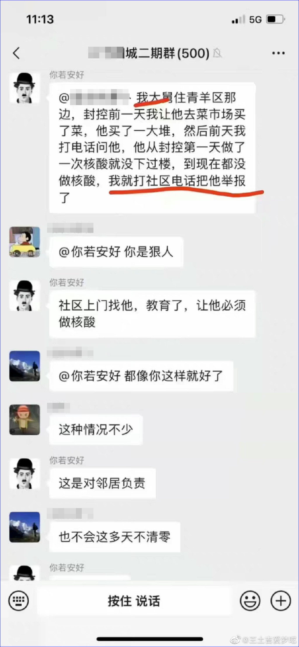 这位外甥把自己的举报发在小区群里,获得了群里邻居的支持。从聊天中也能看出,这位外甥很开心,甚至还有些在炫耀的味道。