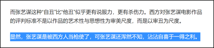 那你看电影,自然会觉得在看另一个世界的故事,无法与电影里的角色共情。现在讲述北上广深的都市电影已经够多了,我们也经常能在网剧里看到在外滩住豪华别墅的男女主角以及分分钟几百万上下的霸道总裁。你大可以去看那些作品,没人逼你一定要理解《隐入尘烟》里记录的农民爱情。但不要忘了,还有不少人曾经的生活状态就是这样,甚至有些人至今也还过着这样的生活。他们也需要影片去记录,去表达。你过着光鲜亮丽的生活不要紧,但你一边过着美好生活一边指责别人的生活脏,那就有点太过分了。每一次中国作品在外拿奖,就有人讽刺,哎,又靠苦难拿奖了,真有你的。当张艺谋拍了好电影,他们就说《秋菊打官司》《红高粱》《一个都不能少》是将“丑陋”的元素展示给西方人看。 于是,张艺谋成了他们口中被西方当枪使了的人,代表了站不起来的奴性。又过了几年,莫言拿到了诺贝尔文学奖,又有人说了,你写得太夸张。你写的内容,网上查不到,是不是编造了抹黑农村的材料?诺贝尔奖早已成为美西方利用的工具,你的“文学作品”如果不符合美西方的胃口还能得诺贝尔奖吗?莫贾芳之流的“文学作品”就是诋毁、抹黑、唱衰中国的毒药!