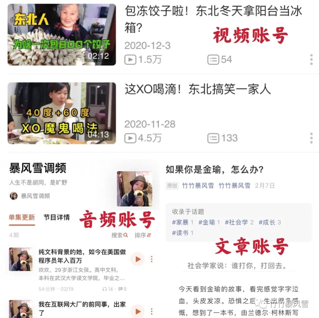 如上图,我当时视频做的是东北风的日常生活记录,播客做的是对身边“不走寻常路”的人的访谈,文章写的是对社会事件的社会学分析,彼此之间完全不搭噶。