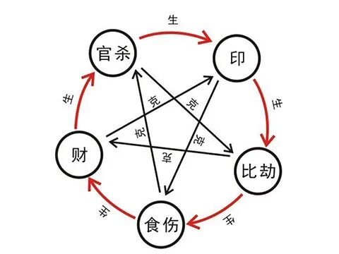 “十神学”细分下来,主要对应着:官杀、比劫、食伤、财、印,这五种性格不仅仅是元素堆砌这么简单,它们相互之间总是产生相互的作用力和化学反应,也就有了类似与五行学的下图。