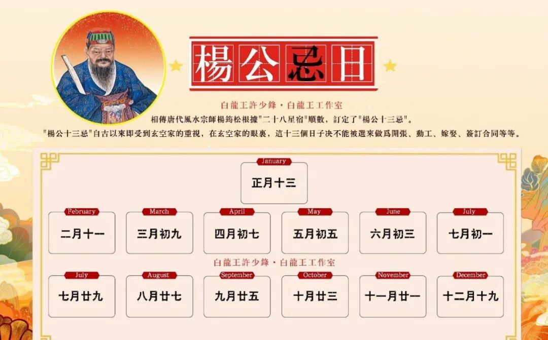 “杨公十三忌”自古以来即受到玄空家的重视,在玄空家的眼里,这十三个日子不能做为开张、动工、嫁娶、签订合同等等。