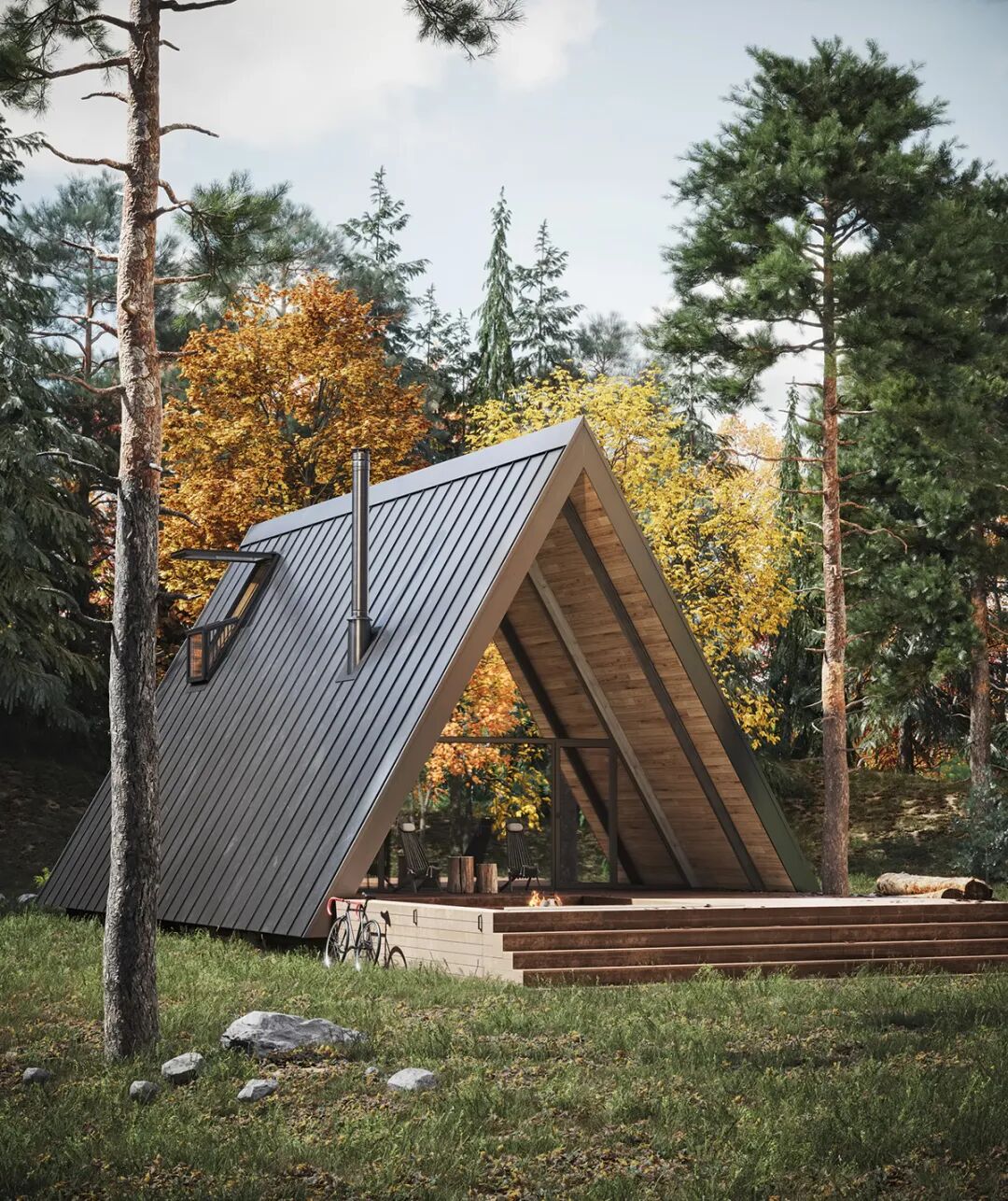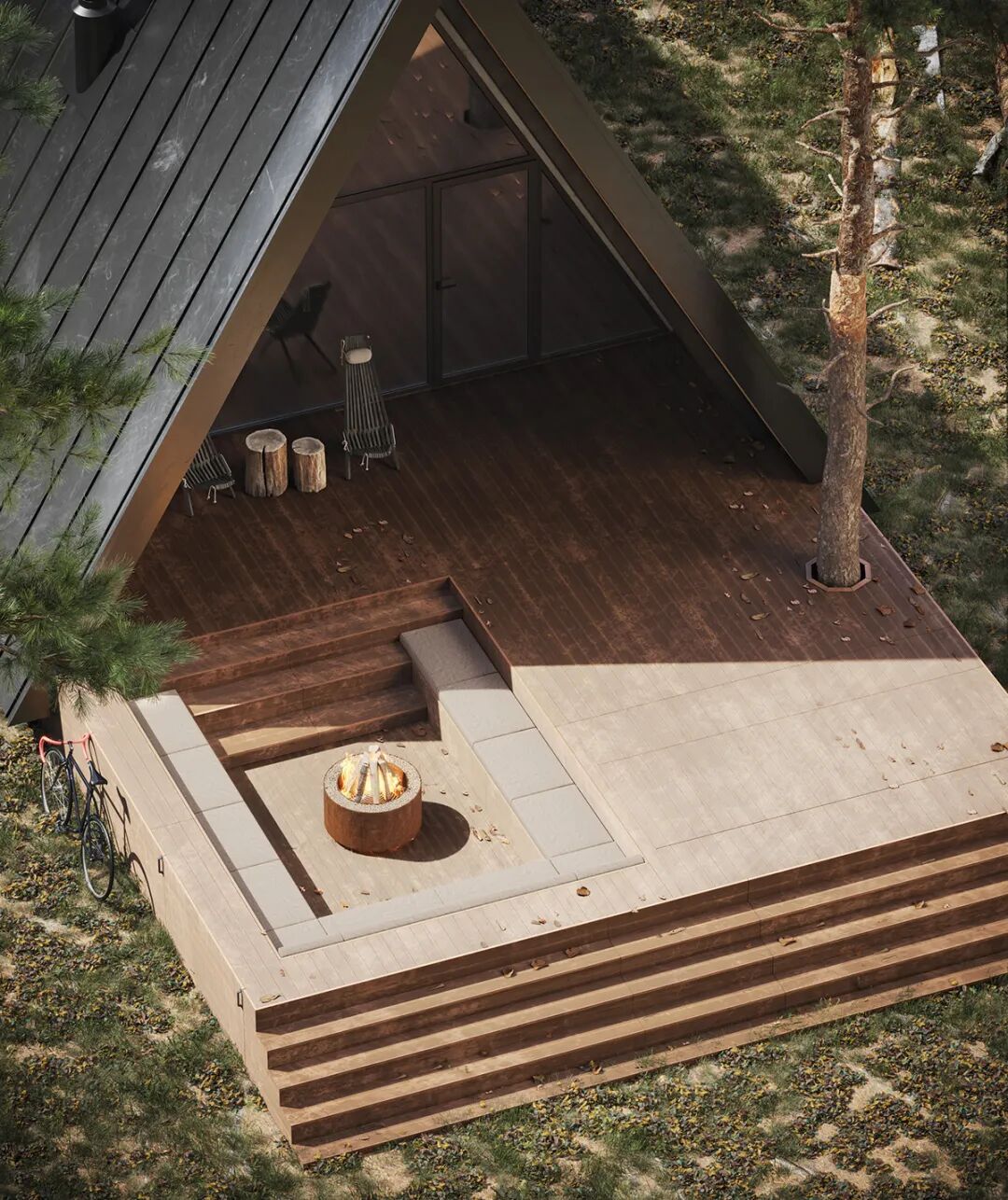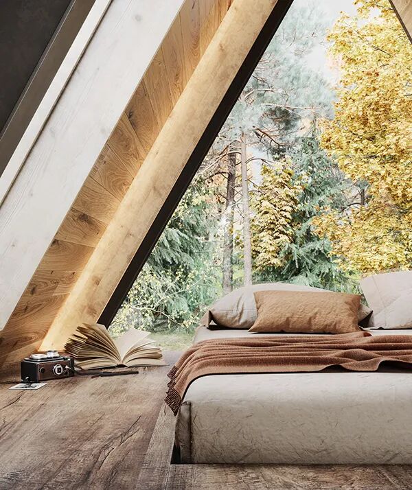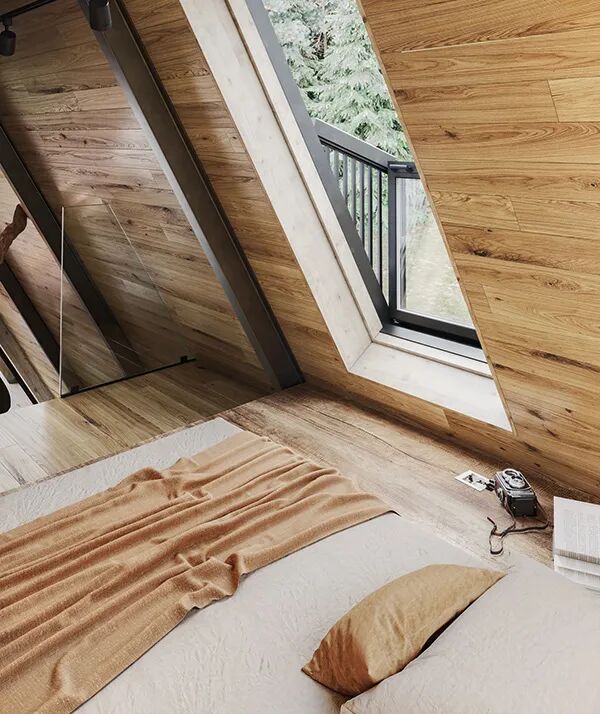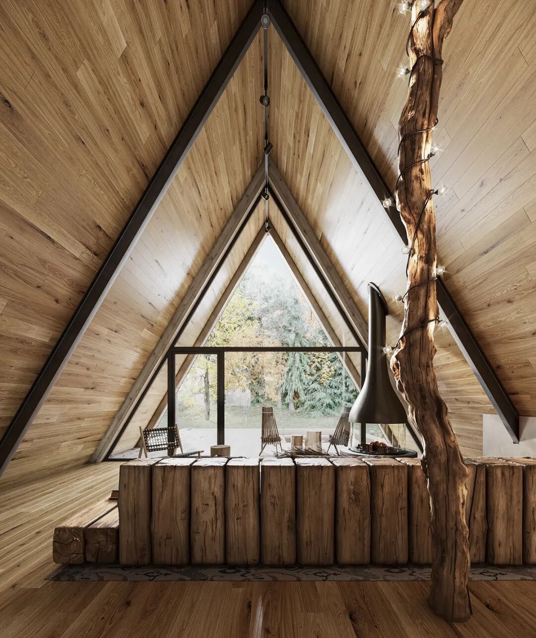 该项目位于乌克兰的喀尔巴阡山脉,是一座私人住宅,为热衷于亲近自然的客户所做。灵感来源于雨后的森林。项目占地80㎡,大量的木材营造出舒适的感觉,房屋带有松木的味道。屋内有全套厨房用具和生活必要的功能区。整个房子只有一间卧室,可以容纳3-4人的露营和聚会。为了让建筑更好的与自然融合,设计师选择了三角形的结构,以此来模仿搭建在森林中的帐篷。大面积的窗户也使室内的森林景观透入室内,使居者真正感受到与自然的亲近。