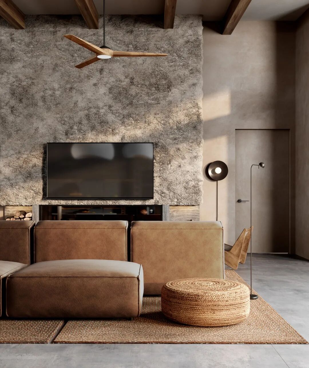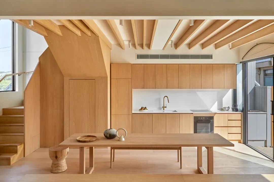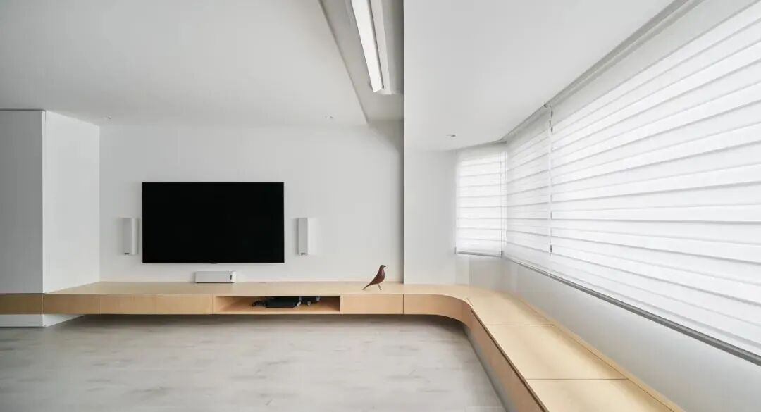 所有的材料都尽量追求最原始的状态,客厅中的沙发带有一丝现代极简主义的气息。对于照明设备,设计师把它们隐藏起来,让客户全身心地感受最自然的氛围。同时,也体现了侘寂美学无需繁华、直指本源的精神。02.