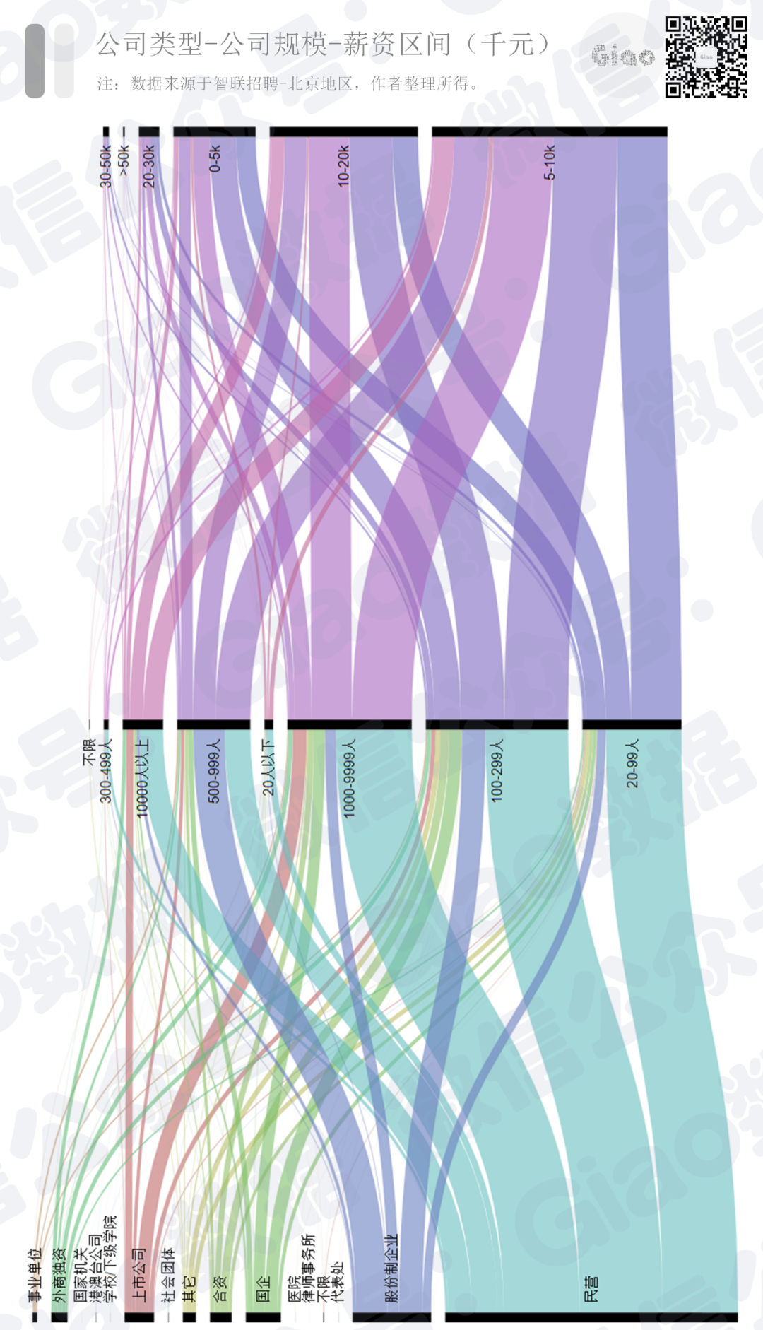 从公司规模与薪酬区间关系来看,无论公司规模如何,均有相当比例的岗位薪资回报处于较低薪酬区间(0-5K/月),也均有一定比例的岗位薪资在20K/月以上,且薪酬越高,岗位的数量越少(桑基图带宽)。因此,公司规模无论大小,薪资结构总是类似于金字塔形,“二八定律”再次显现。