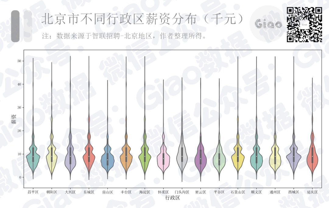 同时,我们统计了北京地区各区平均月薪资情况(千元/月),绘制了如下小提琴图。