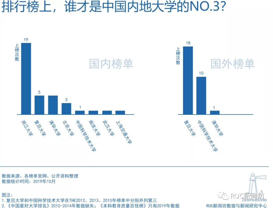 看热闹不嫌事大,我们综合了上述排行榜数据,发现近十年最受国内排行榜青睐的“老三”是浙江大学,而国外排行榜则更偏爱复旦大学。