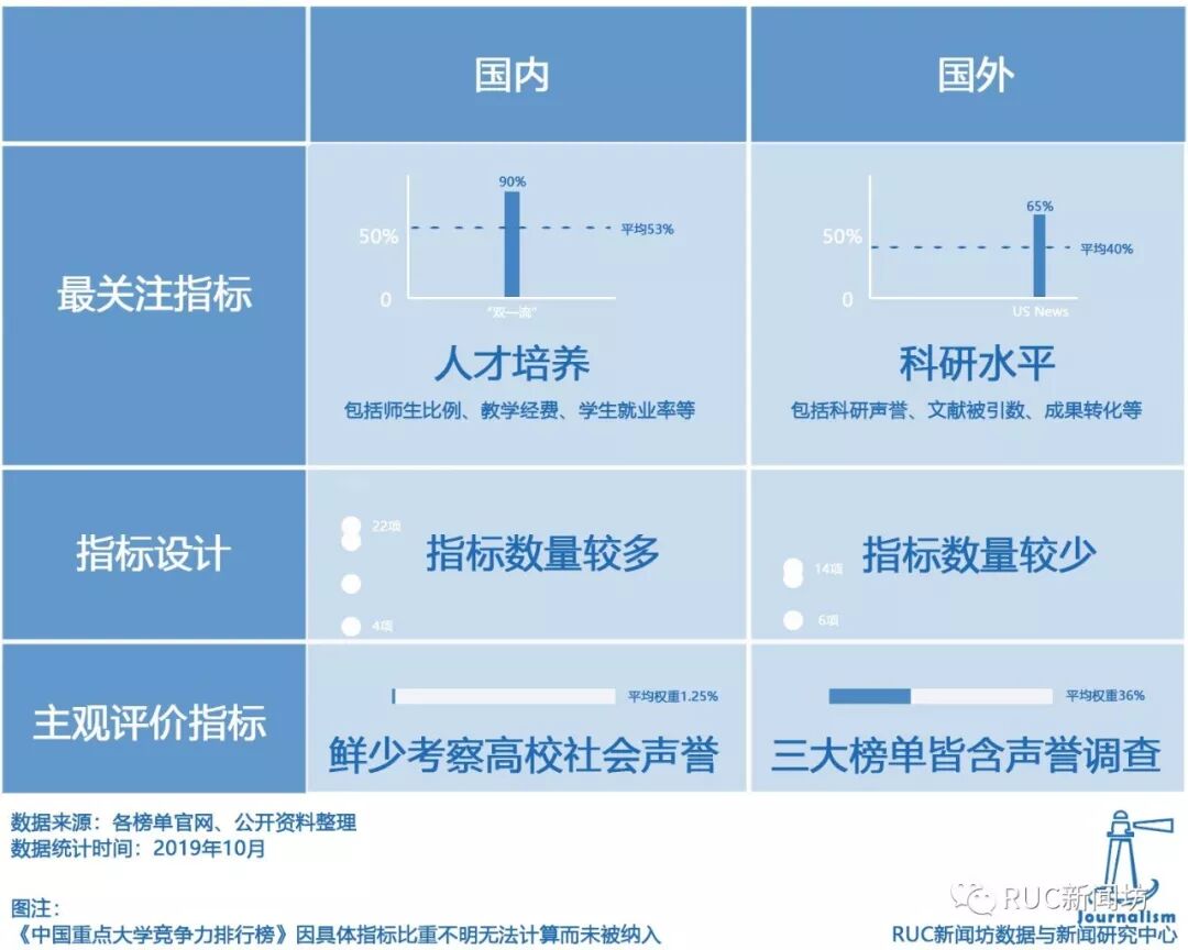 如果把这些指标再做进一步的分析,我们就能发现国内和国外在评价大学时不同的标准指向: