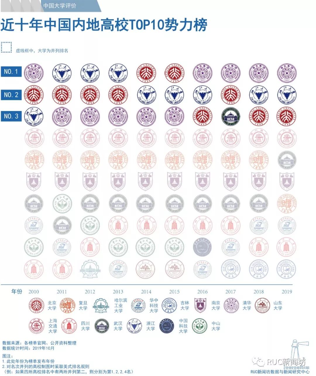 数据说明:图中选取的是中国大学排名(校友会版)、软科中国最好大学排名、“双一流”建设高校本科教育质量百优榜、中国重点大学竞争力排行榜以及武书连中国大学评价排行榜数据,其中中国大学排名(校友会版)、中国重点大学竞争力排行榜以及武书连中国大学评价排行榜数据为2010-2019年;软科中国最好大学排名自2015年始,故数据为2015-2019年;“双一流”建设高校本科教育质量百优榜自2019年始,故数据为2019一年。