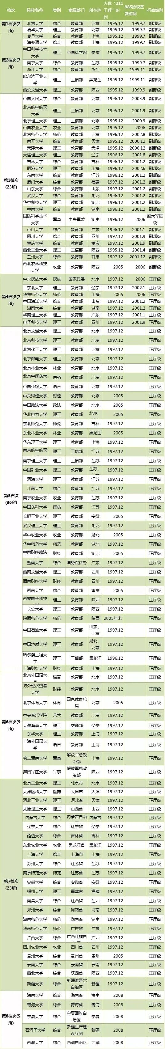 前4个档次为211工程大学中的985工程大学,共39所;后4个档次为211工程大学中的非985工程大学,共73所。它们在国家重视态度、政策支持力度、资源倾斜程度等几个方面有所不同。