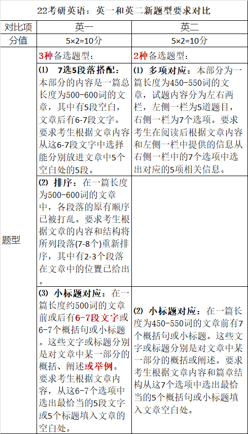 八、英一和英二新题型要求对比