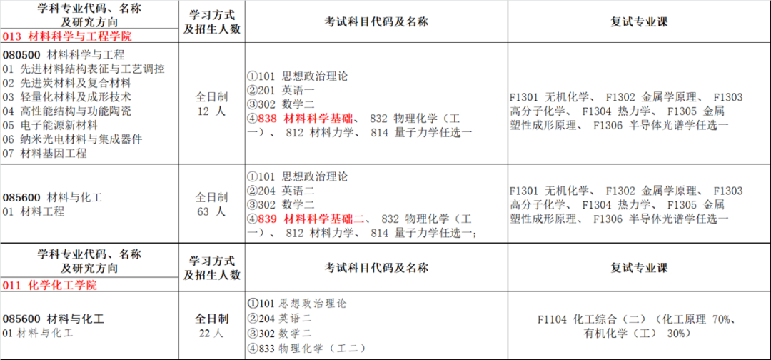 一、学硕838(材料科学基础或者物理化学),学制3年;