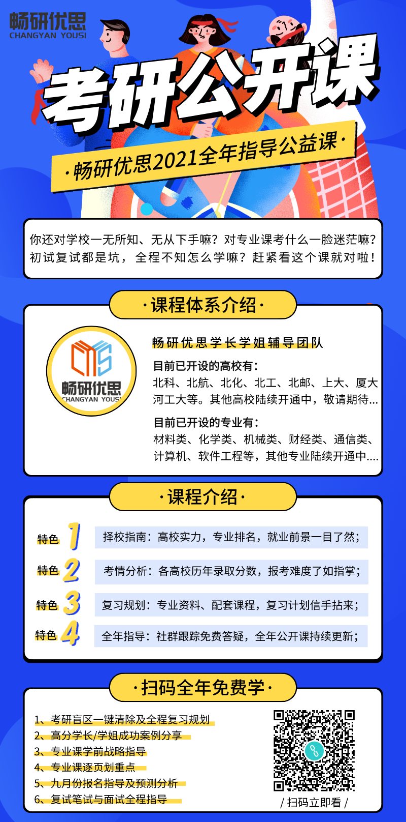 今年,畅研团队专门打造了【2021全年指导】公开课,对畅研粉丝免费授课,目前已上线北科、北化、北航、北工、上大、北邮、厦大、河工大、大工、武理、东大、哈工大、北理等高校,其他高校陆续开通中,扫描下方二维码或关注【畅研材料考研】公众号观看&了解更多课程!