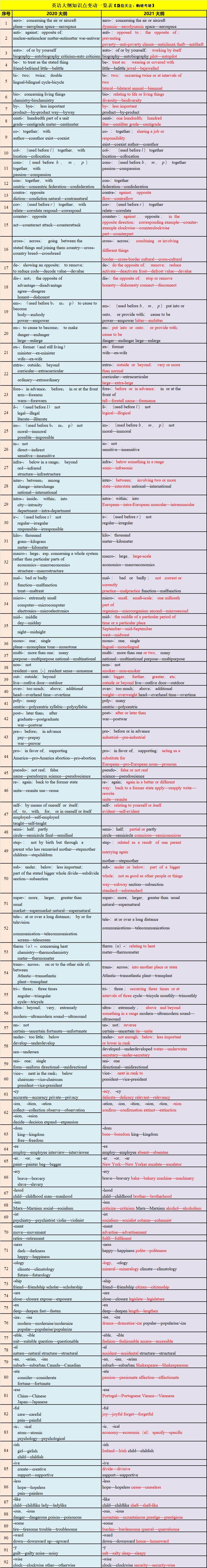 词缀总数由 116 个增加至 140 个。其中前缀 81 个,与去年相比增加 19 个;后缀 59个,与去年相比增加 6 个,个别后缀进行了整合。另外前缀的英文释义进行了扩充,例词也发生了变化。