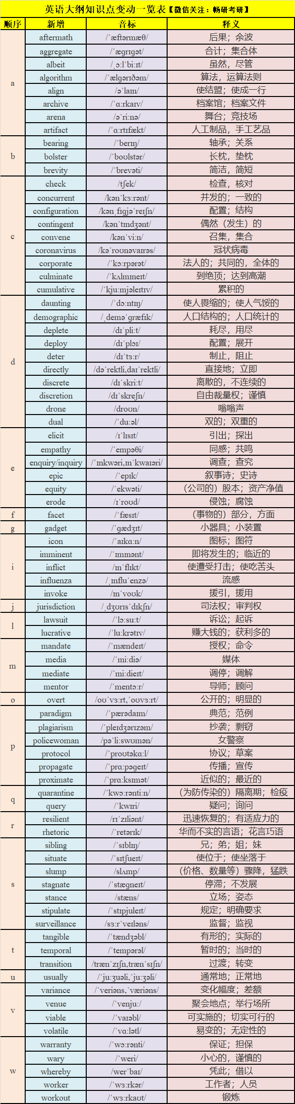 总词汇量由去年 5497 个增加到 5522 个,其中新增词汇 81 个,删减词汇 46 个,与此同时大纲对 144 个词汇进行了变动,主要是根据拼写和意思进行整合,调整后变为 140 个。新增词汇中加入了与新冠疫情、流感、无人机、算法等相关的词汇,并删掉一些词频较低的词汇,这体现了考纲的与时俱进和灵活性。