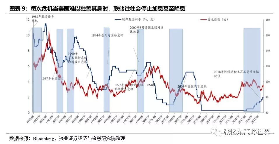 对全球配置型资金主导的新兴市场而言,这是危中有机,每次美国经济和股市遭遇下行压力时,联储往往都会停止加息甚至降息。在海外风险进一步释放之后,一旦美国货币政策开始调整,那么,海外流动性将迎来改善的转机,有助于避险资产和新兴市场反弹。不过,这大概率要等到明年中期。