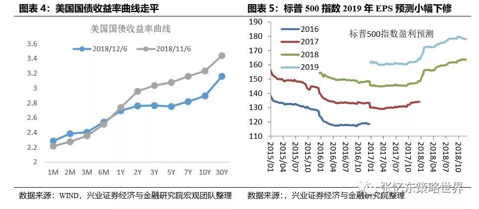 1)我们自10月初开始提示美股大幅补跌、走熊的风险,该判断逐步被验证。美国国债收益率曲线走平,对增长的担忧导致美股波动再度加大。10月份以来,标普500指数2019年的盈利预测没有继续上调,反而出现了小幅下修。