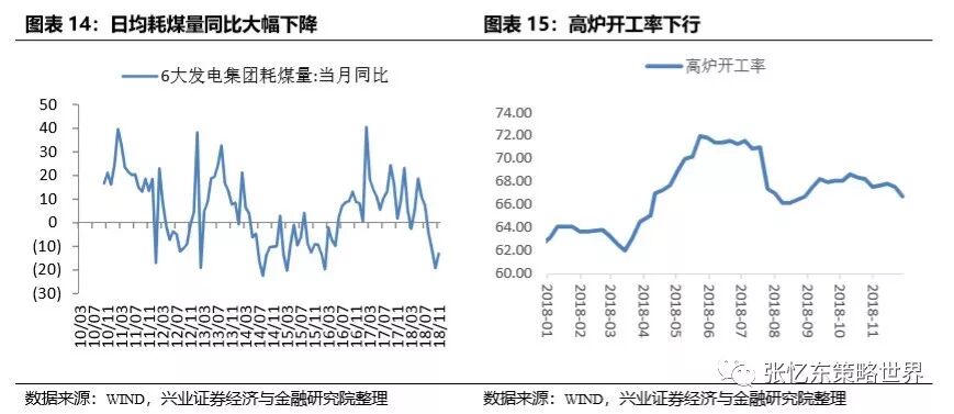 11月PMI下降至50,已经处于繁荣和衰退的临界点上。从主要分项来看,需求回落,生产回落,价格回落,库存被动上升。新订单指数50.4,较上月下降了0.4;生产指数51.9,较上月下降0.1;购进价格指数从10月58大幅下降至50.3,出厂价格指数从52下降至46.4;产成品库存从47.1上升至48.6。高频数据和PMI反应的趋势相一致。6大电厂日均耗煤量同比下降12%;高炉开工率持续下行。