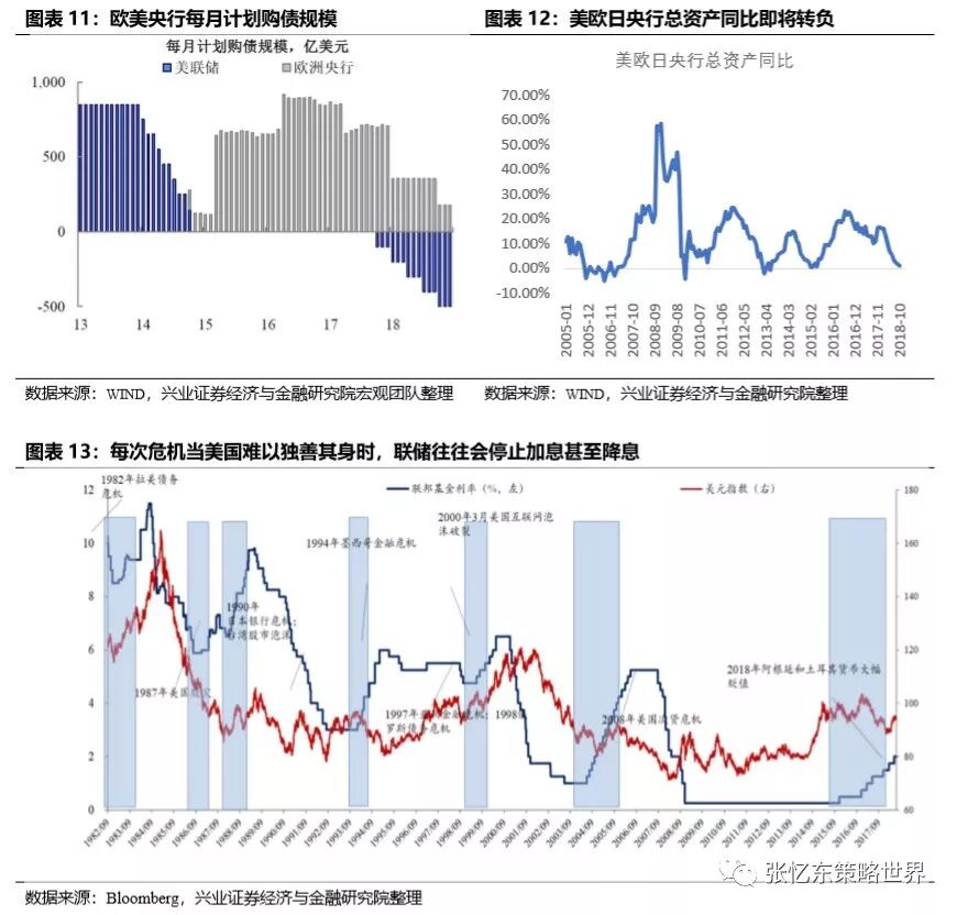 首先,美联储缩表进程比加息进程更确定,欧洲央行12月议息会议已经确认今年12月结束QE。虽然,欧央行维持利率不变并预计将保持至2019年夏天,并且明确至少在首次加息一段时间后才会启动缩表。但是,按照目前的安排,美欧日三大央行的总资产同比2019年极有可能转负,这意味着全球流动性的继续收紧。