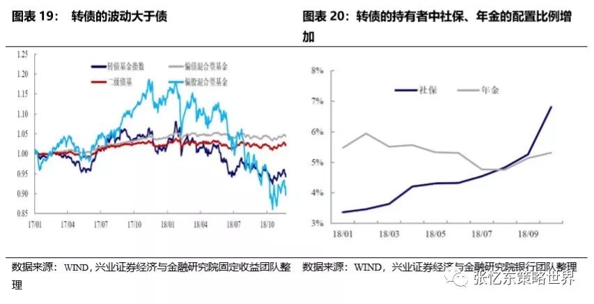 其次,战略性看好正面临双向大扩容的可转债。首先,从转债的投资逻辑来看,利率仍有下行空间,考虑政策对冲,信用风险压力有所缓解,资本市场的风险偏好有望逐步回升,股票的估值也处于底部区域。第二,更长期的机会来自市场的大扩容,外资、银行理财、养老等配置型资金的流入值得期待。外资的长钱可以通过参与优质公司发行的可转债,以较低的风险来配置中国的优质资产。银行的理财子公司发行公募理财明年开始正式运营,由于更擅长债权投资,也可能更愿意先通过投资可转债市场来提高收益率。社保机构的变化,持有转债的占比从去年年底的3.05%上升到10月的6.81%,已经超过券商自营持有的比例。
