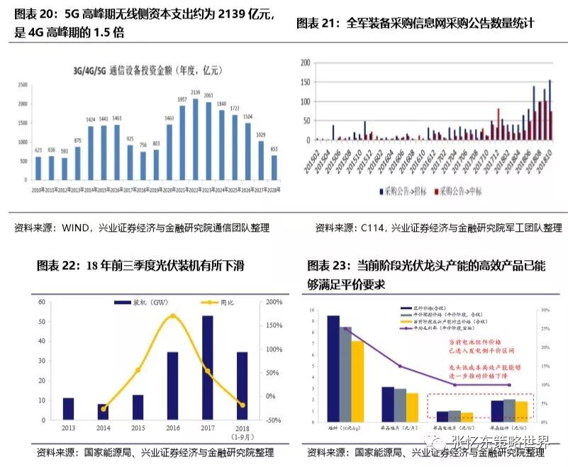 新能源:光伏板块,18年政策消化期,需求端“内忧外患”,19年步入平价切换期,即将迎来“内外齐升”。行业至暗时刻已过,龙头逆势扩张高效产能叠加小厂出清,龙头盈利能力有望修复。风电板块,18年需求回暖,19年有望迎来抢装,龙头公司在手订单创新高,行业持续景气。