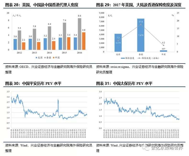 逢低增持,守候保险龙头的长期价值回归:1)短期看,上行不易,利率下行周期压制保险公司估值;2)中期看,保险行业仍处于转型阵痛期,监管政策改变,龙头公司竞争力提升,寿险行业中的前五大公司占原保费收入的比例56.1%,较2017年底上升了3.9个百分点,较2016年底上升了6.8个百分点;3)长期看,中国保险业开始处于高速成长阶段,值得长线资金逢低布局。4),PEV估值已经处于历史底部。