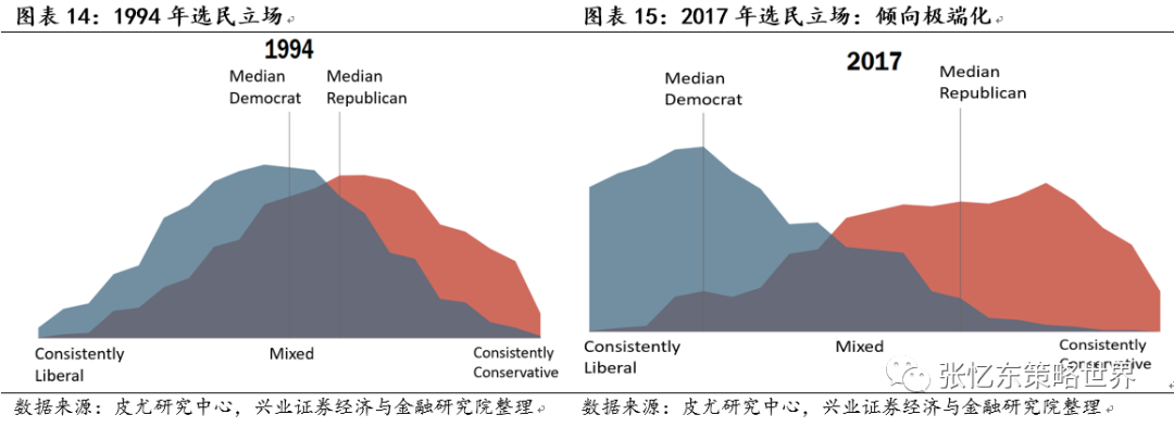 美国近年来无论是选民还是政党,政治立场极端化趋势明显。根据皮尤研究中心的调查,在1994年,被调查选民普遍选择中间派立场,而在2017年的调查中显示,大部分选民开始极端化,倾向极端保守化(conservative)和极端自由化(liberal)。特朗普总统在上一次的美国总统选战中很好地利用了“民粹主义”。