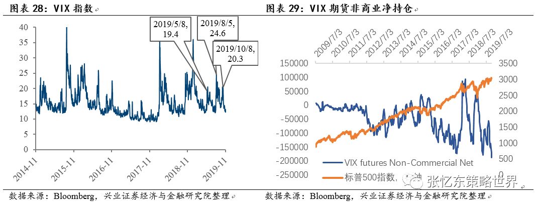 2020年美国本身的政治经济不确定性将成为影响美国股市情绪的主要变量,而中美贸易谈判或英国脱欧等外部风险弱化,所以,美股较高的风险偏好较难长时间保持,risk on/risk off还会有拉锯。截至11月8日,VIX指数降到历史低位的12.1左右,VIX期货非商业净持仓当前处于历史新低。需要当心的是2020年2季度美联储政策红利释放告一段落以及美国总统大选初选中的“民粹主义”。