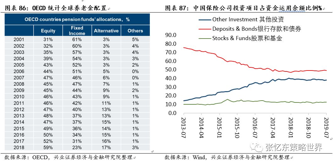 海外养老金配置的启示:随着全球利率下行,主要养老金不断提高权益类资产配置比例,截至最新公布2018年数据,OECD国家养老金权益类配置占比从2001年31%上升到2018年的59%;截至今年7月,中国保险公司资金运用中,权益类资产仅仅占了12.7%,未来有巨大的提升空间。