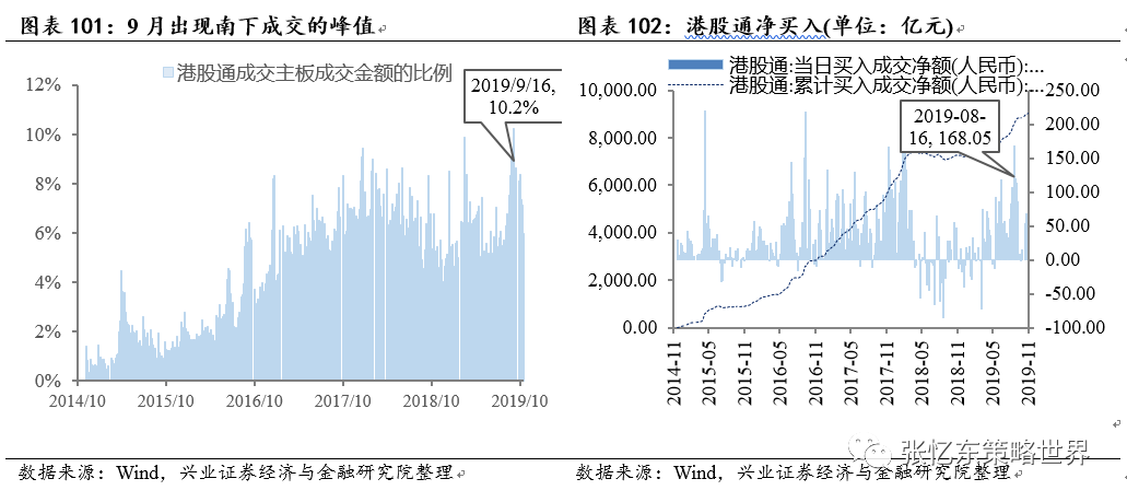 与港股外资流向相反,8月见证了南下资金净流入的峰值。8月16日这一周,南下资金流入168亿元,为18年年初以来的峰值。随着外资的撤离,内资在9月份迎来港股通成交占比的局部峰值。9月16日,港股通成交占比为10.2%。