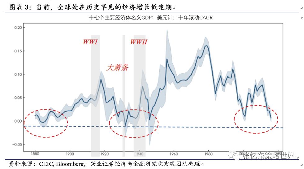 根据兴业证券宏观团队的研究,当前17个主要经济体的债务率(债务/gdp)达到创纪录的90%,无论短期利率还是长期利率均触及或靠近0的历史低位,但是,名义GDP十年滚动CAGR增速已经向下靠近上世纪30年代。