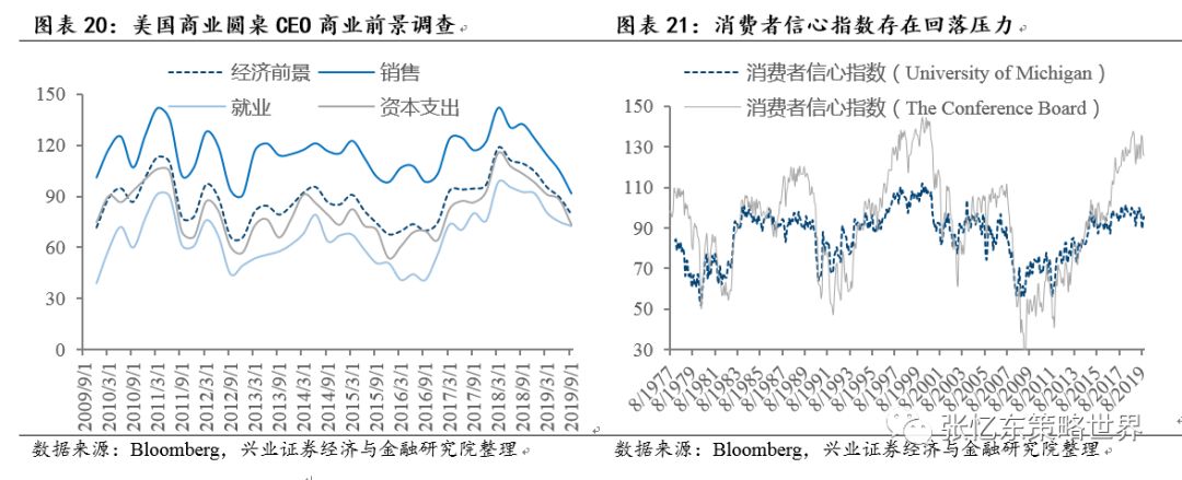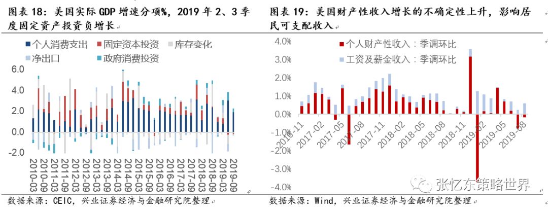 消费是2019年美国经济最重要的支撑力,但是,当前消费者信心开始出现下滑;另外,财富效应是美国消费的重要动力,财产性收入影响美国居民可支配收入,如果2020年美股市场波动加大,那么居民消费动力或承压。