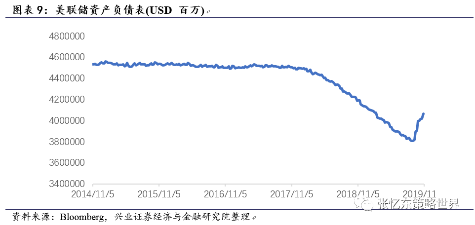 与2018年四季度全球投资者对美联储货币政策的悲观预期不同,当前市场对于2020年全球货币政策环境较为乐观,市场预期美联储2020年还有1次或2次的降息;9月初以来美联储的资产负债表已经扩大了2050亿美元,这相当于欧洲央行一年才能完成的扩表规模,提升了市场对QE的期待。美联储还启动了每月购买600亿美元短期国债至2020年6月的计划,总购债规模为5400亿美元。