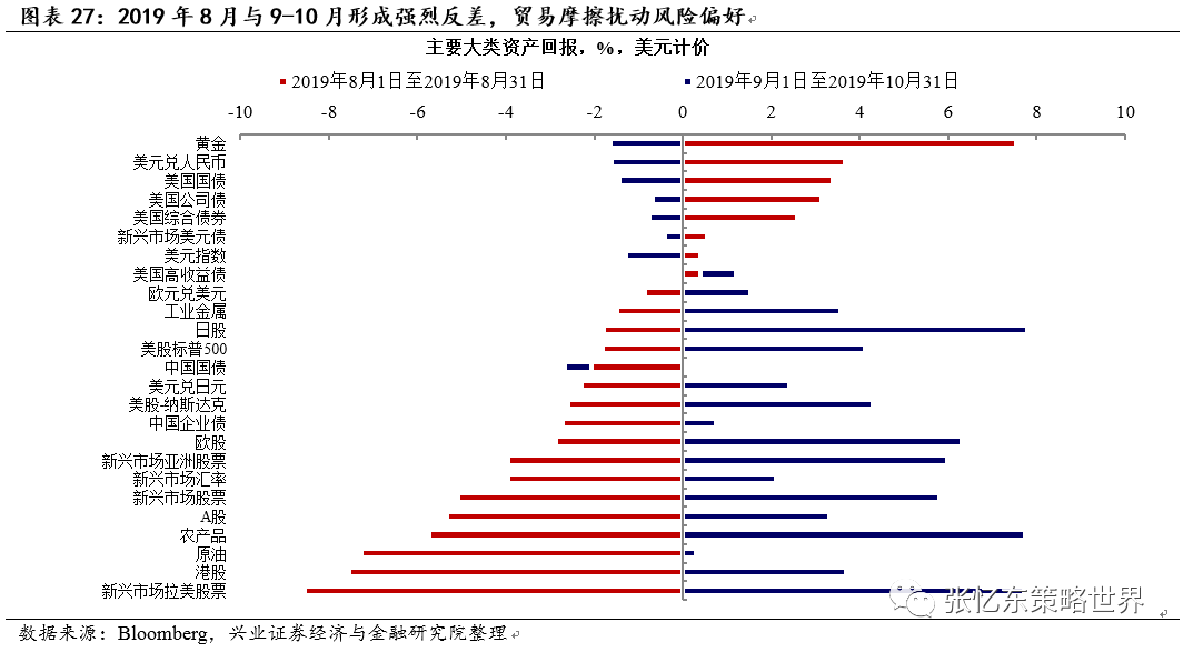 一旦避险情绪减弱,面对“资产荒”的全球资金配置将更关注“性价比”、愿意承担更多风险来追逐高回报。2019年9月之后,随着全球宽松落地、中美贸易摩擦形势缓和,投资者风险偏好回升,全球风险资产反弹、避险资产下跌,股市回暖。