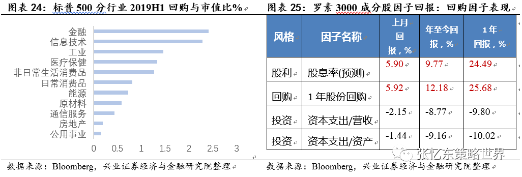 第四,2020年要小心上市公司回购(buyback)超预期下滑。2019年回购(buyback)是支撑美股盈利稳定、驱动估值提升的关键变量。从Bloomberg股票因子表现来看,股息率和回购因子年初至今(10月底)取得了9.8%和12.2%的正收益,回购金额靠前的金融、信息技术、工业的美股股价表现均靠前。但是,随着美股估值到高位,美股上市公司回购的动机已开始减弱。标普500预测市盈率现在为18.6倍,高于1990年以来3/4分位数。而2018年Q4标普500成分股公司回购金额高达2170亿美元,2019Q1为2012亿美元,2019Q3大幅下滑至1609亿美元。