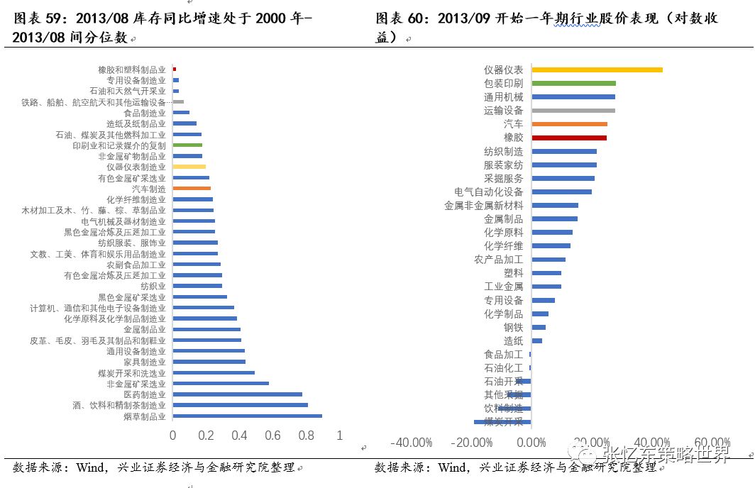在2006年4月这一轮库存周期,开始前,从分位数的角度(2000年1月开始),库存最低的为橡胶和塑料制造业、汽车制造、烟草制造业和化学纤维制造业。在此后的一年里,化学纤维(涨143%)领跑其余行业,汽车制造(123%)次之;分位数角度库存最低的橡胶和塑料制品行业获得119%的收益,位于在列行业第五位。(注:股价收益采用对数收益,对数收益会系统性低于真实收益。在做库存高低比较时,库存水平均使用当前库存同比增速对比2000年1月以来的分位数)
