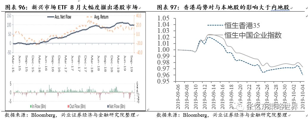 首先,港股市场的资金面受全球投资者主导,2019年香港局势的恶化,并没有影响到投资者对金融市场的过度担忧。数据上,发达市场投向新兴市场ETF(约20%的规模投向港股市场)净流入在8月份有一个较大的下滑,而之后的9、10月份,ETF资金净流入维持在一个相对稳定的水平。
