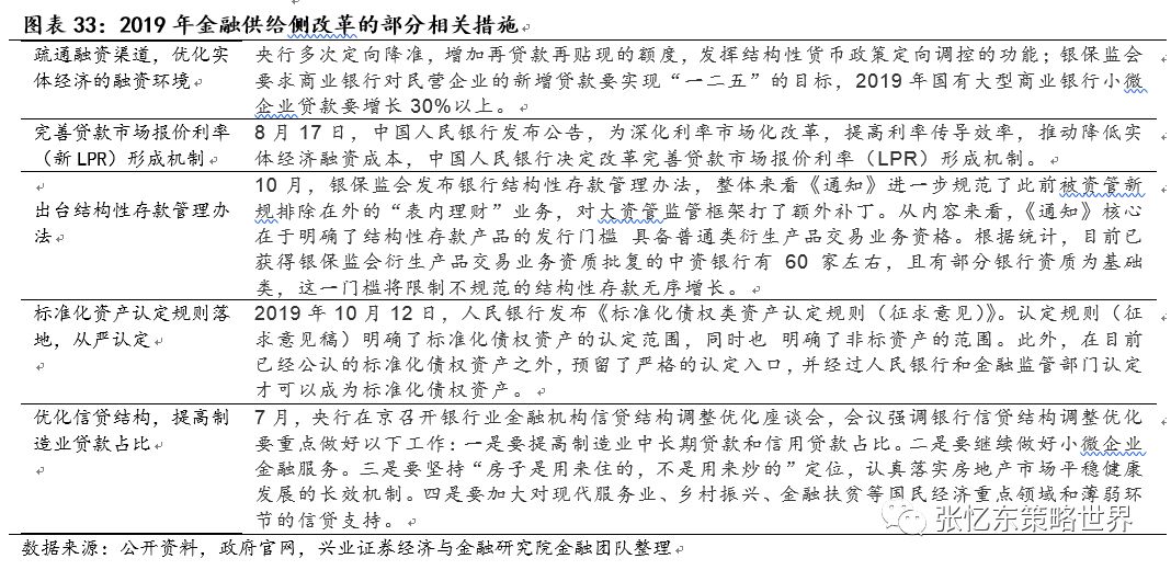 2019年中国在改革方面,继续落实和推行供给侧结构性改革,进一步落实金融供给侧改革,强调经济高质量发展、激活微观主体的活力,突出体现为,推进利率等关键领域改革,疏通货币政策传导渠道,优化民营、中小微、新经济等实体经济的融资环境。