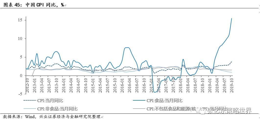 首先,2019四季度后期乃至2020年1季度,国内外投资者对中国经济的预期仍会比较悲观,担心“滞胀”风险。最新公布的10月CPI同比增长3.8%,PPI同比下降1.6%,但是,此次通胀具有明显的结构性特征,10月份CPI的分项中,食品类同比增长15.5%,而非食品项同比增长0.9%。因此,所谓“类滞胀”其实是“假滞胀”,不会出现货币政策收紧,最多只是有可能阶段性抑制货币政策进一步宽松。