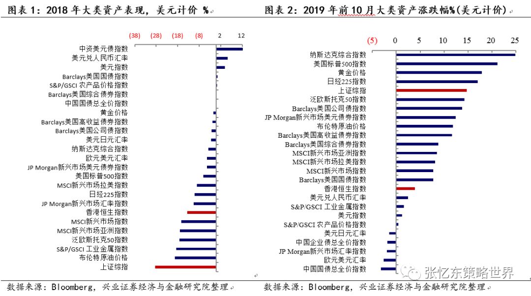 ——回顾2019年前10个月全球大类资产表现,以美元计价的涨幅,A股以15%的表现在全球名列前茅,远强于港股表现。