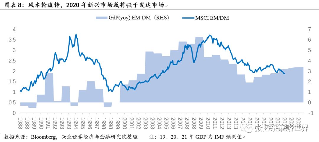 根据我们对于中国经济转型的乐观预期,以及IMF对于2019-2021年全球GDP的预测,未来两年新兴市场的经济相对增速有望进一步强于发达国家,从而,有助于全球资金重新“风水轮流转”向以中国为代表的新兴市场配置。