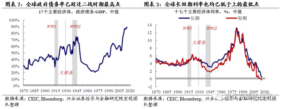 根据兴业证券宏观团队的研究,当前17个主要经济体的债务率(债务/gdp)达到创纪录的90%,无论短期利率还是长期利率均触及或靠近0的历史低位,但是,名义GDP十年滚动CAGR增速已经向下靠近上世纪30年代。