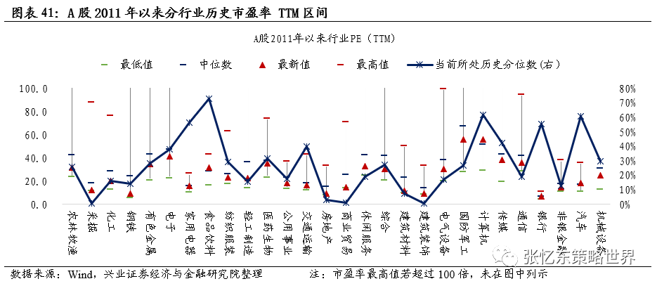 首先,A股行业纵向估值市盈率(PE TTM)分析,截至12月初,有色(28%)、军工(27%)、电子(38%)、化工(16%)、电气设备(17%)、通信(19%)、机械设备(30%)等行业市盈率都处于2011年3月至今的历史较低水平(行业括号内百分比数值为当前最新估值所对应的历史分位数)。