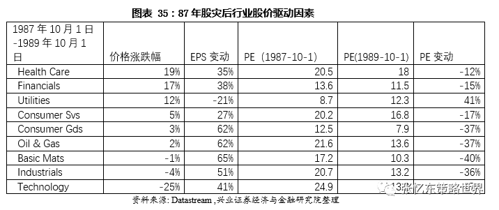 股灾后的美股上涨,并不依赖于估值的提升,主要靠盈利驱动。从1987年10月19日到1989年7月,标普500PE从16.84倍继续下降至12倍。从行业表现也非常明显,股灾后盈利成为驱动股价增长的主要动力。除了公用事业因为本身估值较低,PE还出现了一定程度上涨,其他行业估值都出现了不同程度的下降,股价的上涨主要来自EPS提升。