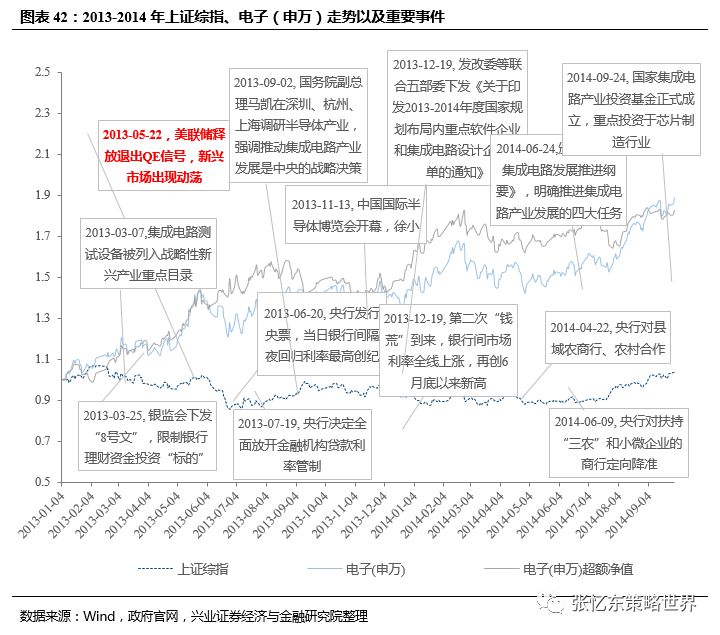首先,海外风险的冲击,对科技股中期的影响不大,因为中国的科技股以内资机构为主导。我们以2013-14年的创业板、电子行情为例分析。