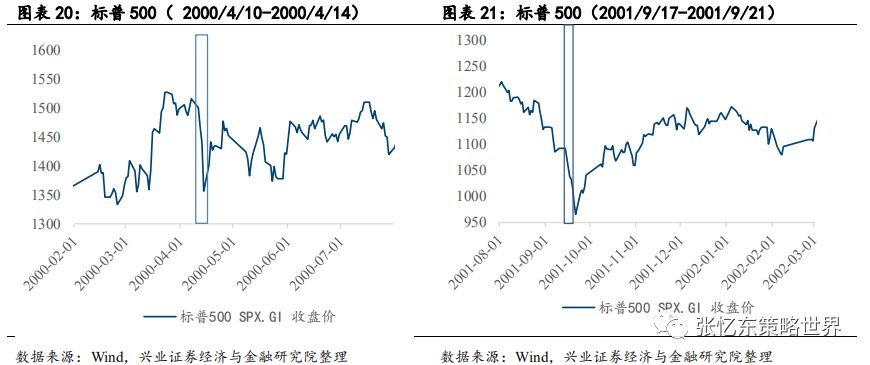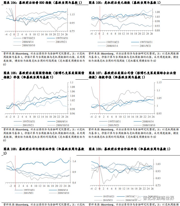 标普500指数,短期震荡,中期牛熊不一:从整体看,标普500指数在冲击(跌幅较大周)后,短期均出现上涨回调趋势,中期各次冲击后牛熊不一,除08年金融危机影响较为深远外,标普500指数在其他各次冲击后半年内均震荡回调至较为稳定的水平。 美元指数在此冲击后的6个月呈涨势:08年金融危机后美元指数下滑,冲击后半年仍在低位徘徊,其他次冲击发生后美元指数均上涨,冲击后6个月仍位于高位。 美国国债在此冲击后的6个月呈涨势:短期内,除00年4月美国国债指数在冲击后下跌外,美国国债指数在历次冲击后均呈现上扬趋势。中期,冲击后6个月内美国国债指数净值均上涨。 美国公司债在此冲击后的6个月呈涨势:危机对美国公司债的冲击较为短期,公司债指数在冲击后的2-4周内出现不同程度的下跌,随后开始上涨,于冲击后两个月内回归冲击前水平。(值得警惕的是,危机会使得企业债承压,我们的结论基于彭博巴克莱美国综合公司债收益指数,纳入指数的都是优质公司,可能存在样本选择偏误,仍需防范黑天鹅) 黄金在此冲击后的6个月表现平稳,无明显涨跌:总体来看危机后黄金价格表现较平稳,金价除08年金融危机后短暂的大幅下跌外,其他次危机后,均在小范围内上下波动,呈现较为稳定的特性。 原油在此冲击后的6个月呈跌势:除00年4月那次冲击外,原油价格在遭遇冲击后均下跌,并且在冲击发生后的半年内长期在低位徘徊。复盘08年,危机中的黄金
