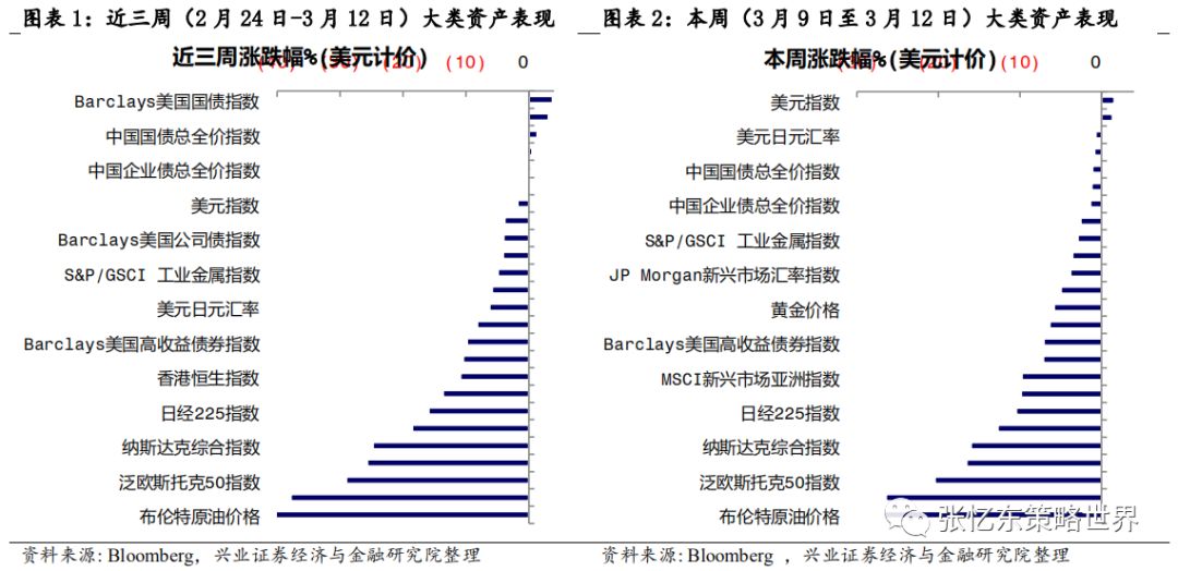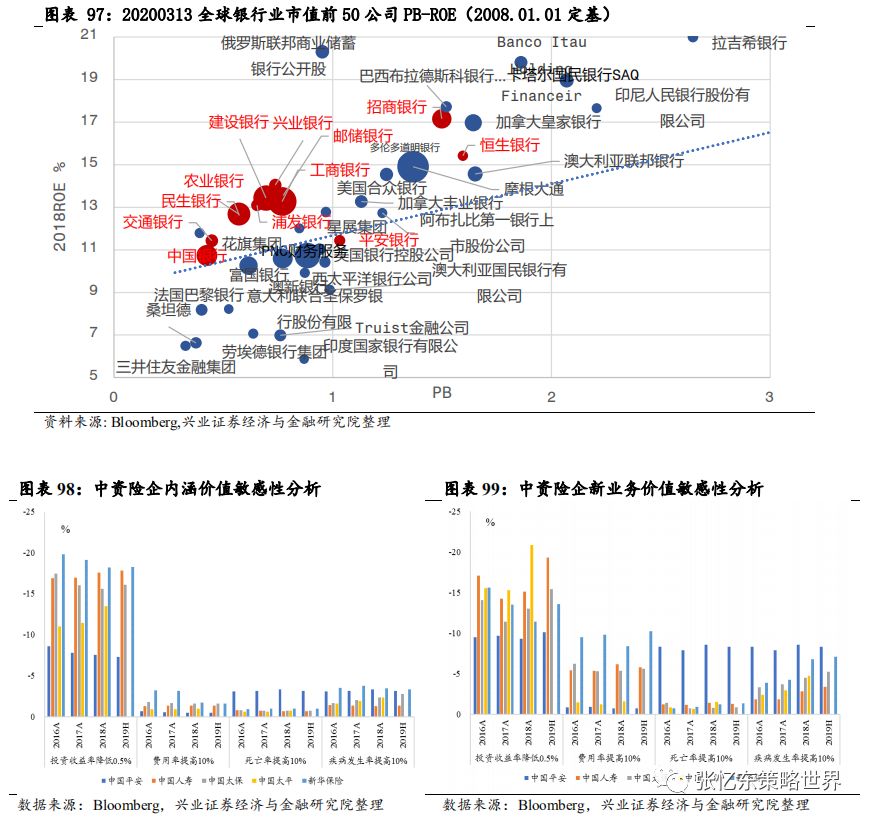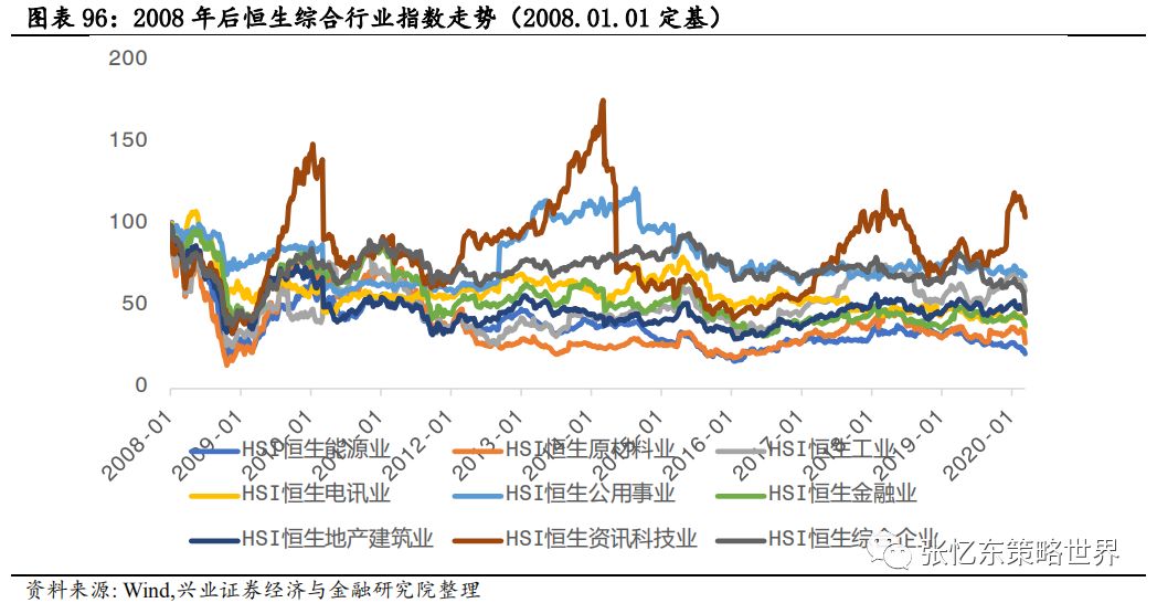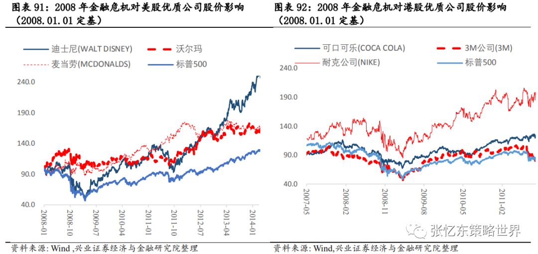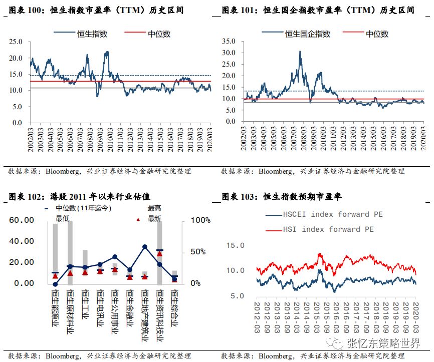 5.2.2、次贷危机为例,核心资产短期不能避险但更快创新高、长期涨幅巨大首先,2008年金融危机对美国股市的核心资产而言,也是场考验,有些公司类似雷曼兄弟这样的百年老店破产了,对于活下来的反而更强大。 沃尔玛和麦当劳这样的消费龙头,2008年股价下跌幅度明显小于大盘指数,并且,在危机之后很快就超过危机前的高点。 迪士尼,股价暴跌,跌幅与标普500相当,但相较于标普500用了5年时间恢复到之前的水平,迪士尼仅仅用了1年半。所以,精选那些中长期的确定性高的核心资产,危机的恐慌时刻正是逢低布局的好时机。 2008年金融危机之后,自2009年3月开始,港股开始了新一轮牛市行情。研究此段历史,可以看到大危机之后估值因子大幅走强,即价值股走牛。从200903-201505区间因子收益来看,本轮牛市的股价推动源于估值修复,PE和PB因子表现抢眼。此外,股息率因子表现同样抢眼。2008年金融危机,港股各行业普遍受到冲击,各行业出现不同程度的下跌。恒生资讯科技业2018年度跌幅达63%,跌幅排名第二。然而,2009年资讯科技业年涨幅达205%,涨幅在港股行业中居首位,率先回升至危机前水平。拉长时间轴来看,2008年金融危机正是资讯科技业逢低布局的好时机。5.3、投资建议:“危”中有“机”,立足长期逢低增持中国核心资产5.3.1首先,建议长钱积极逢低布局,等待全球复苏时收获建议类似巴菲特、中国社保这样的长钱、old monye的打法——以长打短,耐心逢低布局中长期基本面靠谱的中国各领域核心资产(包括金融地产等传统行业的类债券属性的,也包括性价比合理消费股,还有高成长明确的科技成长股)然后卧倒装死,等着全球市场恢复理性之时。 首先,继续关注“类债券”核心资产,在价值股领域“守株待兔”,精选房地产、银行、保险等低估值高分红的蓝筹股。这类核心资产当前的盈利估值的性价比在全球占优,低估值、高股息率提供了“类债券”的安全边际。 具体而言,中国银行业的核心资产在全球同业比较中处于PB-ROE性价比优势特别高的水平,适合中资保险资金、海外old money长线资金配置; 中国保险行业的核心资产,长线受益于中国保险密度和深度的提升,中短线受益于投资收益改善,中短线反弹动能更足; 地产行业的核心资产高股息率、低估值,基本面受益于集中度提升、强者更强,短期在中美贸易摩擦缓和、风险偏好提升以及全球低利率环境的背景下,也有较强的估值修复的动能。其他传统行业价值股,关注股息率提供的安全边际及可持续性,关注在各自细分行业的竞争地位,以及经济稳增长政策、减税等对其盈利的影响。其次,挖掘医药、消费和TMT、先进制造业细分领域的成长机会。但是,短期要警惕高估值抱团取暖的板块可能受损与存量资金再配置的分流风险。所以,建议更大范围寻找性价比合适的消费或科技领域的核心资产,进行逢低布局。5.3.2其次,立足长期,一年以上,战略性看多港股,便宜是硬道理港股的估值处于历史的底部,全球比较来看,性价比更高。截至3月13日,恒指预测PE(彭博一致预期)为9.4倍;恒生国指预测PE为7.5倍,二者均处于2005年7月以来的1/4分位数附近。恒生指数当前静态估值水平(TTM市盈率)为9.8倍;恒生国指PE-TTM为7.8倍,二者均处于2002年以来的1/4分位数附近。当前恒生指数的股息率为4.3%,处于2006年9月以来的高位。5.3.3第三,长期来看科技依然是未来三、五年的主旋律,耐心淘金中国科技核心资产 精密制造:1.1、半导体设备、锂电设备等新兴行业里面找“小巨人”;1.2、军工领域:核心配套生产、优质基础电子元器件;1.3、传统设备:油气设备、工程机械和铁路设备等领域,围绕“强者恒强”找景气改善的弹性。 化工及新材料;2.1、具备一体化、规模化、科研实力强大的传统化工白马龙头;2.2、新材料领域的小巨人;2.3、农化等细分领域的冠军。 以新能源汽车产业链为亮点的汽车产业链;3.1、新能源车产业链上的电池、负极材料、电解液和隔膜等;3.2、汽车领域优势龙头和特斯拉产业链。 节能和新能源产业链;4.1、光伏板块产业链;4.2、风电板块里装机高端匹配领域;4.3、电力自动化;4.4生产型制造向服务型制造转变的白色家电。 以5G、半导体为亮点的TMT产业链:5.1、5G终端产业链的硬件和服务商龙头;5.2、5G带动下的“2B”、“2C”端的新应用领域;5.3、5G网络设备等通信基建设备;5.4;半导体、智能硬件平台及5G基站相关产业链。如何将这次海外市场大震荡映射到历史上?从股票市场角度来看,从80年代至今,标普500指数单周跌幅10%以上的,只出现过4次:1987/10/19-1987/10/23“黑色星期一”那一周、2000/4/10-2000/4/14互联网泡沫破灭之初、2001/9/17-2001/9/21“9.11”事件后第一周、2008/10/10次贷危机时创下单周最大跌幅的那次。