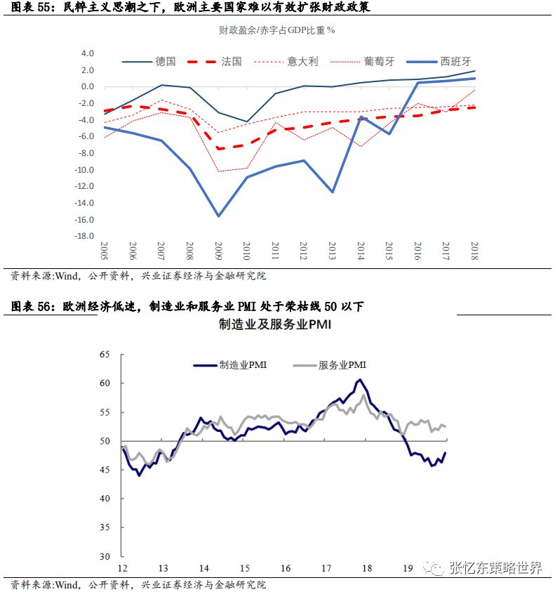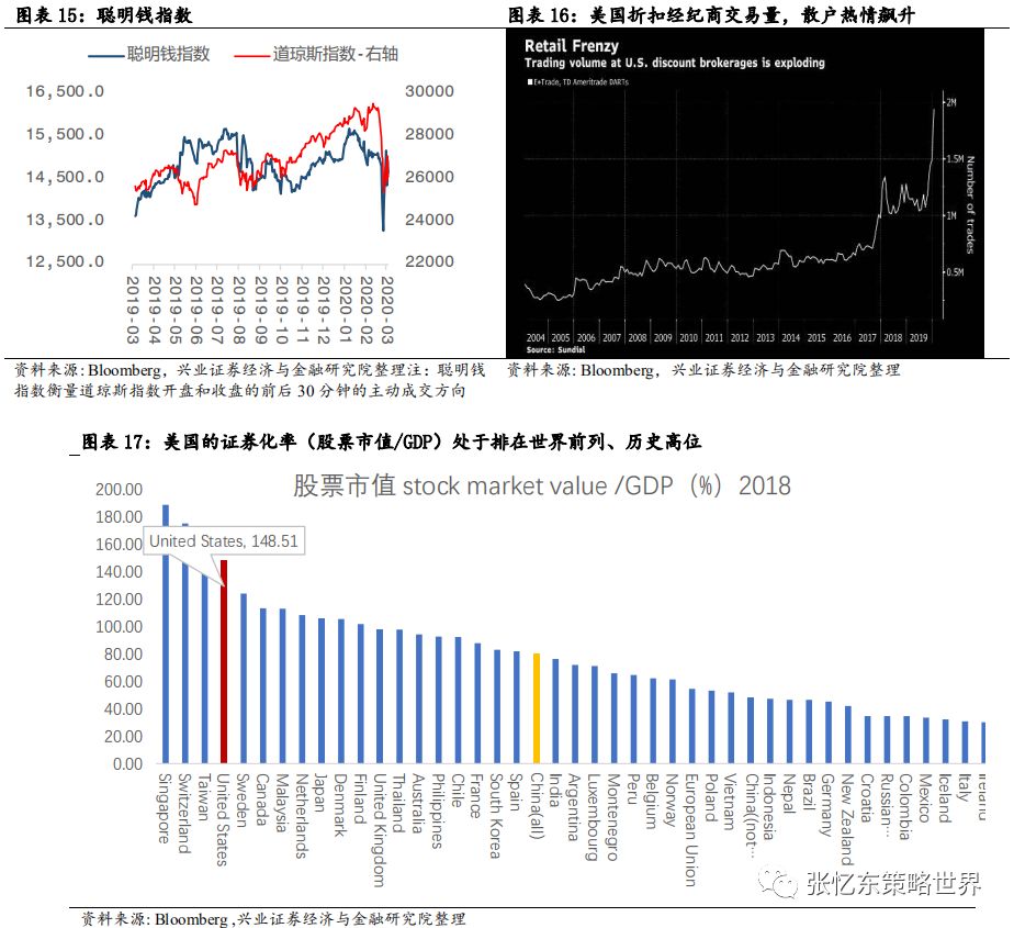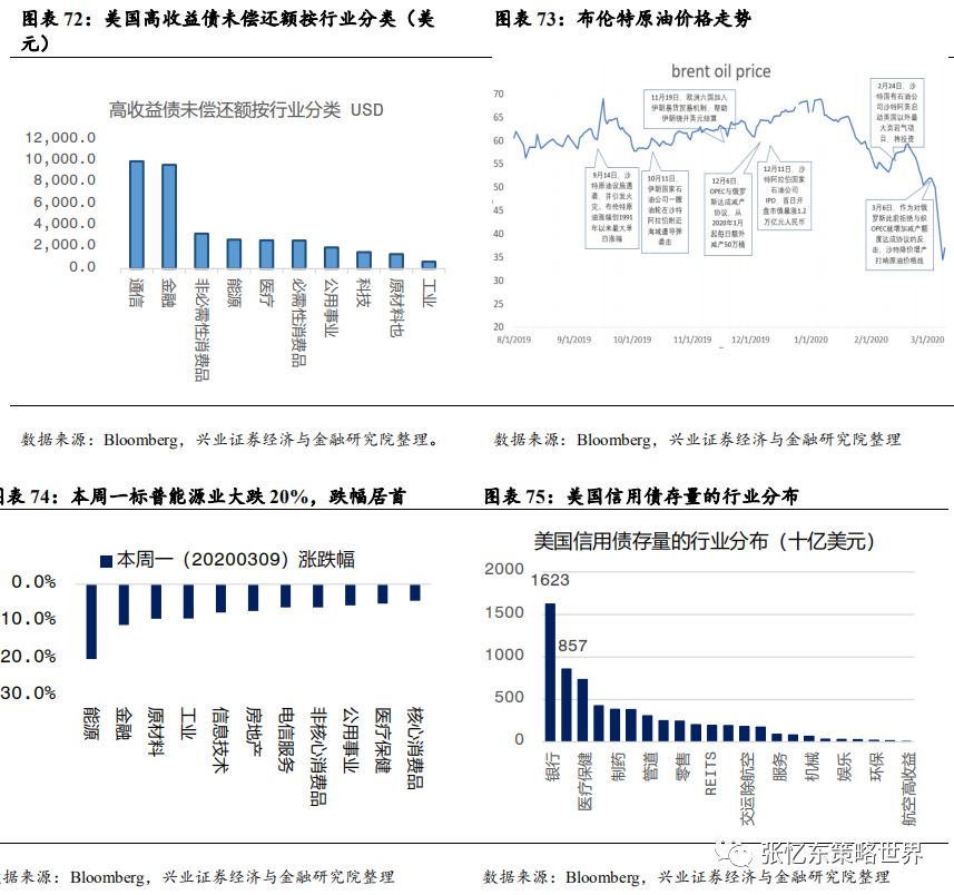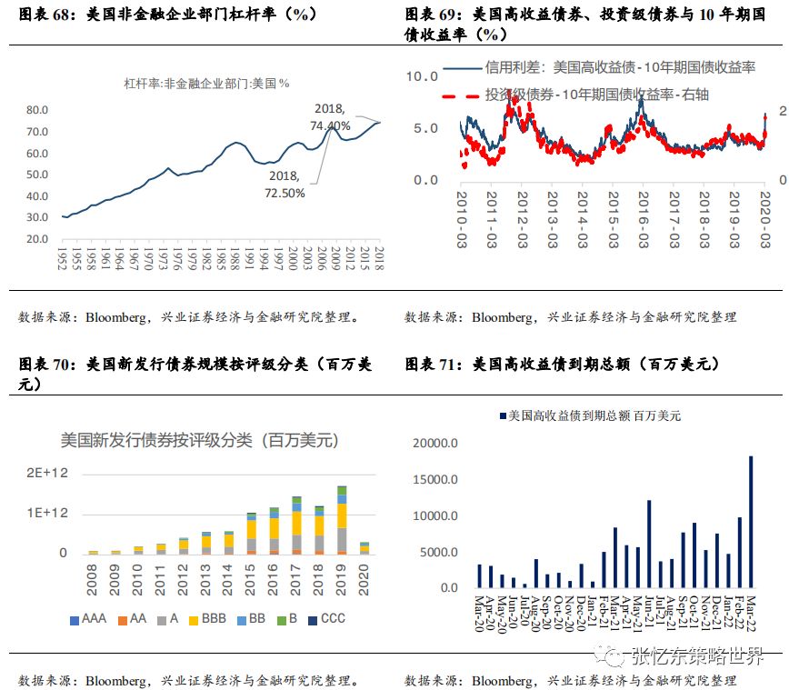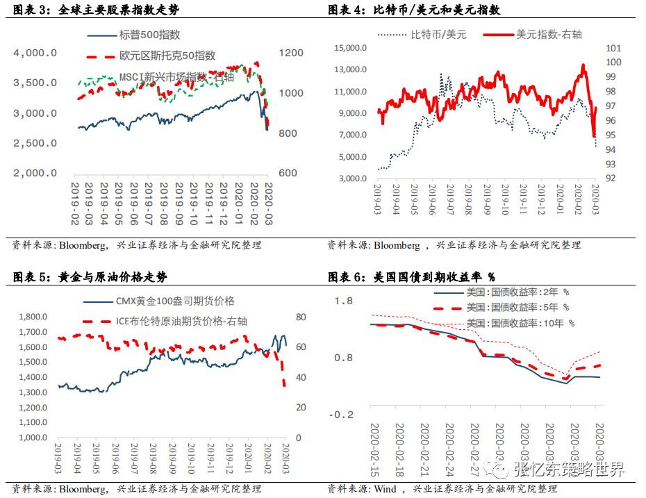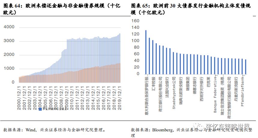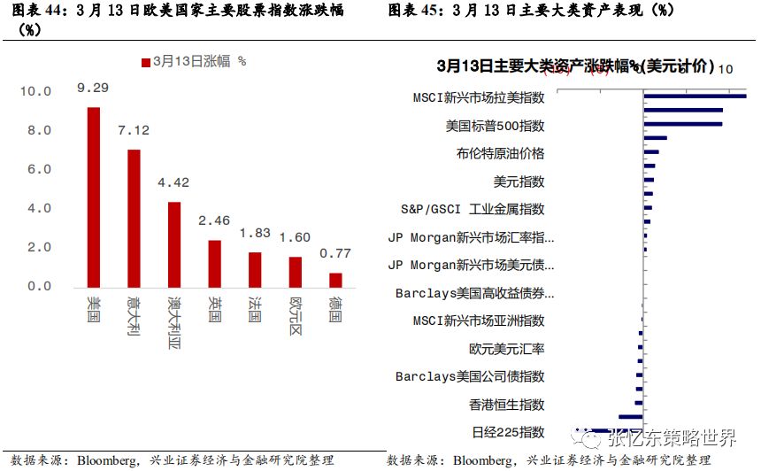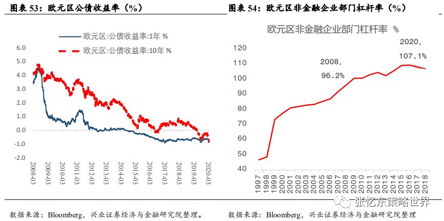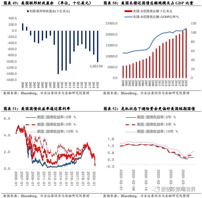 其次,特朗普携手美国各方政治力量,一起解决疫情恐慌。3月13日,特朗普在白宫召开发布会,针对疫情进行全国动员,宣布“美国进入国家紧急状态”。 此举将释放额外500亿美元资金,为各州和地方政府提供大量资源对抗新冠病毒疫情。 会上,特朗普还宣布了针对油价暴跌的应对措施:指示美国能源部长为美国的战略储备购买大量原油。 美国各州应尽快建立应对新冠肺炎的应急指挥中心。同时,针对美国新冠检测能力明显不足问题,特朗普称,美国私人医疗机构将能够在未来一个月内提供500万份检测。 其他,如药品审批速度加快,与私营企业进行合作进行大规模监测,临时取消跨州医疗监管等。美国当地时间3月13日,美股受诸多利好消息的影响,迎来反弹,道琼斯工业指数涨9.36%,纳斯达克指数上涨9.35%,标普500涨9.29%。在特朗普讲话后,WTI原油期货价格盘后大涨5%。3.1.2中国、欧洲及其他国家或地区——政策对冲、共渡难关首先,七国集团财长和央行总裁电话会议。当地时间3月3日早上,美国财长努钦(Steven Mnuchin)和美联储主席鲍威尔牵头举行七国集团财长和央行总裁电话会议,商讨海外疫情扩大及其经济冲击的对策。之后,鲍威尔称“G7声明承诺使用一切可用工具,包括卫生健康政策、财政政策和货币政策,来应对危机。在这一点上,G7达成了高度协同一致。”其次,据外交部讯,二十国集团财长和央行行长在最新声明中一致同意将使用所有可行的政策工具,包括适当的财政和货币措施。 第三,面对海外“股灾”恐慌蔓延,多国近期纷纷降息、或者诉诸量化宽松和流动性工具,甚至纷纷采取了针对“股灾”的限制措施。3月12日,欧洲央行举行议息会议,“意外”维持三大关键利率不变,主要再融资利率为0%、存款便利利率为-0.5%、边际贷款便利利率为0.25%。加大量化宽松,额外增加1200亿欧元资产购买规模直至年底,重点确保私人部门债券购买;为银行提供暂时性的资本援助,允许银行降低资本充足率。 第四,3月13日下午,中国也宣布将实施定向降准。中国人民银行决定于2020年3月16日实施普惠金融定向降准,对达到考核标准的银行定向降准0.5至1个百分点;对符合条件的股份制商业银行再额外定向降准1个百分点,支持发放普惠金融领域贷款。以上定向降准共释放长期资金5500亿元。上述诸多利好消息的刺激下,周五(3.13)欧洲主要股市全线高开高走,欧洲斯托克600指数涨幅一度扩大至4.5%,创下2015年以来最大涨幅。收盘,德国DAX指数涨0.77%,英国富时100指数涨2.46%,法国CAC40指数涨1.83%。首先,美国政府和民间力量近期全力提升美国新冠检测能力之后,我们判断,美国疫情数据有飙升风险,从而,持续压制后续数月欧美市场的投资者信心 其次,美国10年国债收益率,作为全球资产定价的锚,阶段性的不稳定状态仍将延续。美联储大放水之后,已经低于1%的10年期美债收益率,未来为零甚至负利率的预期提升。 特朗普的财政刺激方案,需要让美联储实行更宽松的货币政策来帮助,甚至希望零利率和负利率政策帮助未偿还的国债进行再融资。2019年,美国联邦政府财政赤字高达1万亿美元;未偿还国债总额约为23万亿美元,占GDP比重升至108%。 再下调两次50bp就是零利率,美联储是否做好进入“负利率时代”的准备?相较于2008年金融危机之前,联邦基金利率已经大幅调低,3月3日美联储降息50bp以后,当前联邦基金目标利率为1-1.25%,可供降息的空间不大。 美国10年国债的到期收益率作为全球资产配置的定价之锚,现在已低于1%,未来可能为零甚至负利率,所以,10年期美债当前的波动性有望持续一段时间,那么,就意味着全球资产定价将继续遭遇不稳定性风险。 第三,在危机模式下,不要期待巨量的资金会从美国债券市场撤到中国的债市或股市,反而,要提防从新兴市场撤离回到美国的国库券市场。 根据兴业证券孟一坤博士对2008年金融危机的研究,2008年金融危机时,美元和美国国债市场的避风港效应明显,境外资金回流美债对持有期限结构发生突变,偏好流动性更高的货币市场工具以便随时进行流动性管理。外国官方、境外私人渠道在危机期间都增持了美国短期国债和中长期国债,但迅速调高了前者的配置比例,在各类国库券工具中,6月期最受追捧。 参考2008年危机是美联储的救市节奏以及海外流动性的变化,我们判断,中期在疫情的影响下,欧洲和日本的情况比美国更糟糕,那么,海外的长期资金特别是各国的外汇储备依然会把美债作为主要的避风港。一旦危机升级,3月9号到12号美债收益率曲线的变化就是预演。危机状态下,境外资金回流美债偏好流动性更高的美国短期国债或货币市场工具,2年期国债、1年以内的国库券受青睐。四、中期展望:海外危机初露峥嵘,欧美债务风险才刚开始近期,美国10年期国债收益率大幅波动,无风险收益率这个资产定价的锚失灵,预示着当前不是股市问题,而是经济衰退+金融危机的风险很大。如果本轮海外股灾最终走向全面金融危机,要当心哪些大雷?4.1、最大的一个大雷:疫情和股灾对欧洲经济及债务风险的冲击4.1.1欧洲债台高筑,负利率状况下只能依靠量化宽松苦苦支撑首先,负利率环境下,欧洲企业部门的债务不断抬升,2018年欧元区非金融企业部门杠杆率达到107.1%,而2008年是96.2%。2008年金融危机以来,欧元区公债收益率飞流直下,2014年之后开始深陷极低利率甚至负利率的泥沼中。 其次,过去