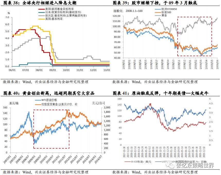 2.4、金融危机的第四阶段:救火(2008年10月-2009年5月)全球主要经济体携手展开大规模刺激计划,2008年四季度中国政府启动“四万亿财政刺激方案”,之后,美联储启动量化宽松,全球央行进入降息周期。金融危机的第四阶段大类资产表现:性价比高的资产率先走出独立行情新兴市场与发达市场股市中期走势出现差异,中国A股率先在2008年四季度见底并开始了持续近一年的翻倍大反弹;但是,美国股市继续下挫到2009年3月,随着3月18日的QE计划推出,美股开启了十年长牛。