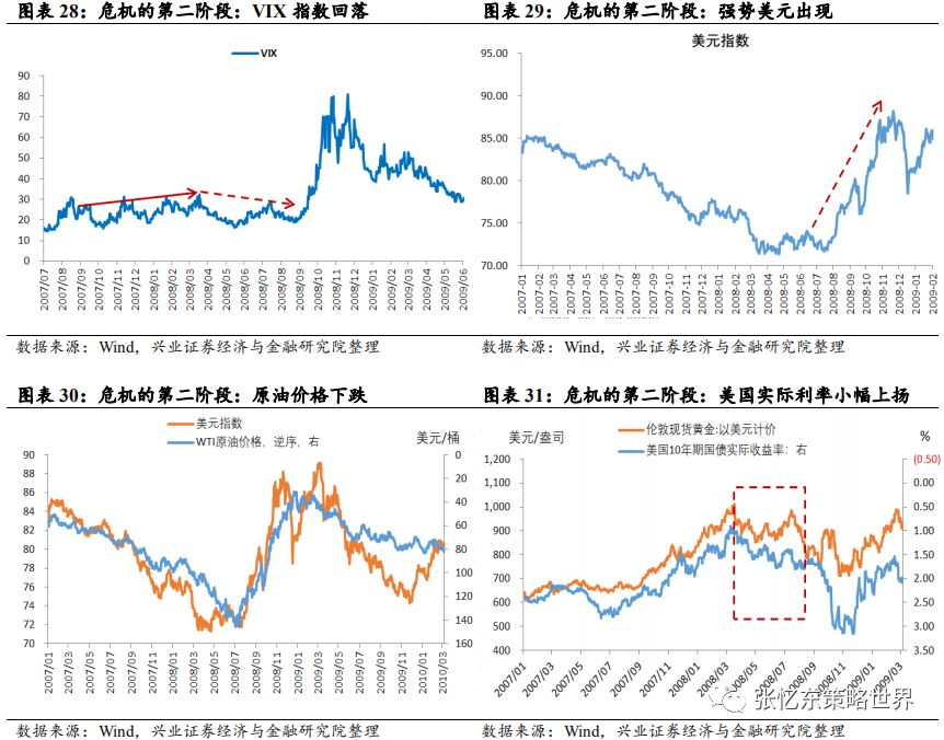 金融危机第一阶段大类资产表现:美元指数向下;原油、黄金等反弹;美债收益率下行;美股开始步入熊市,道琼斯指数从2007年10月高点14198点持续跌到3月10日收盘11740点,期间,最大回撤18%。2.2、金融危机第二阶段:风暴喘息期(2008年3月-8月)美联储的干预行为使得资本市场在3月至8月期间获得一段时间的平静。2008年3月贝尔斯登申请破产,摩根大通利用美联储提供的紧急支持进行了救助。强势美元开始。伯南克于6月3日对美元贬值提出了警告,布什总统于6月9日提出美国将致力于强势美元,保尔森也相继表示稳定美元汇率。这暗示了货币政策决策层更加关注美元、并抵制长期通胀预期出现变化。