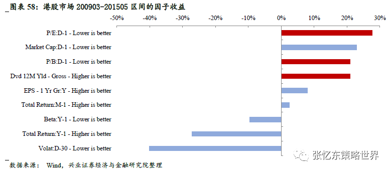 首先,借鉴历史的规律,2008年金融危机之后驱动港股走强的最大贡献——估值因子大幅走强,即价值股走牛。从200903-201505区间因子收益来看,港股股价推动源于估值修复,PE和PB因子表现抢眼。此外,股息率因子表现同样抢眼。
